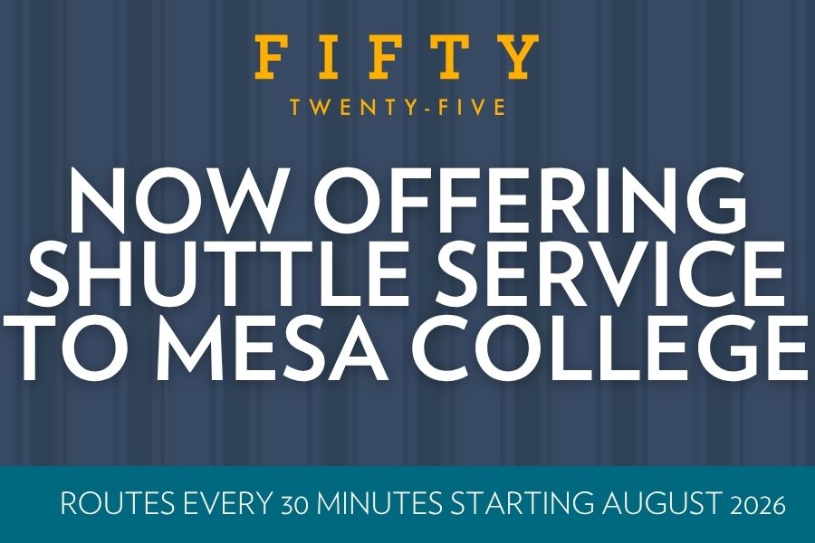 Fifty Twenty-Five is conveniently located near the SDSU campus and the Coronado Naval Base. With great movie theaters, tasty restaurants, and the incredible Balboa Park nearby, there’s never a shortage of things to keep you entertained. At Fifty-Twenty Five, home is more than just a place you sleep. We consider your needs and provide you with amenities and a lifestyle that reflects your personality. Go on, explore!